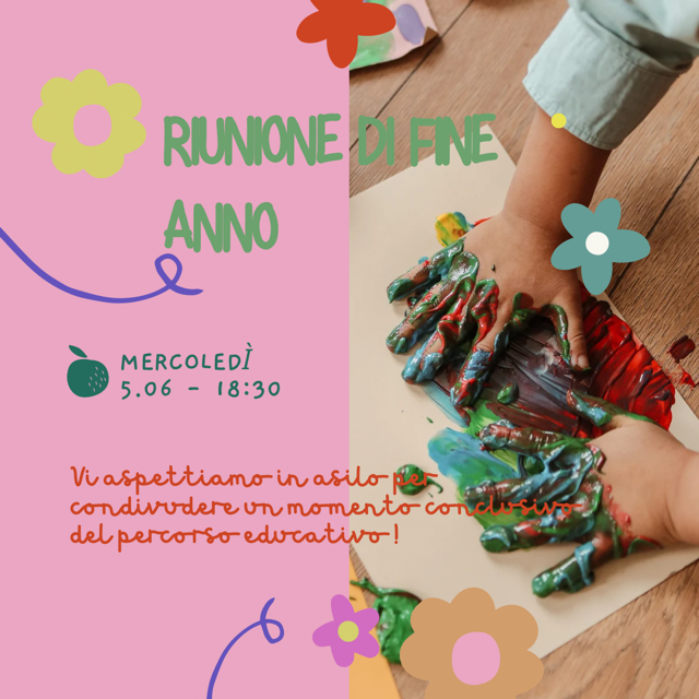 I genitori di tutti i bambini della scuola dell'infanzia e della sezione primavera, sono invitati a partecipare alla riunione di fine anno MERCOLEDI' 5 GIUGNO alle ore 18:30.